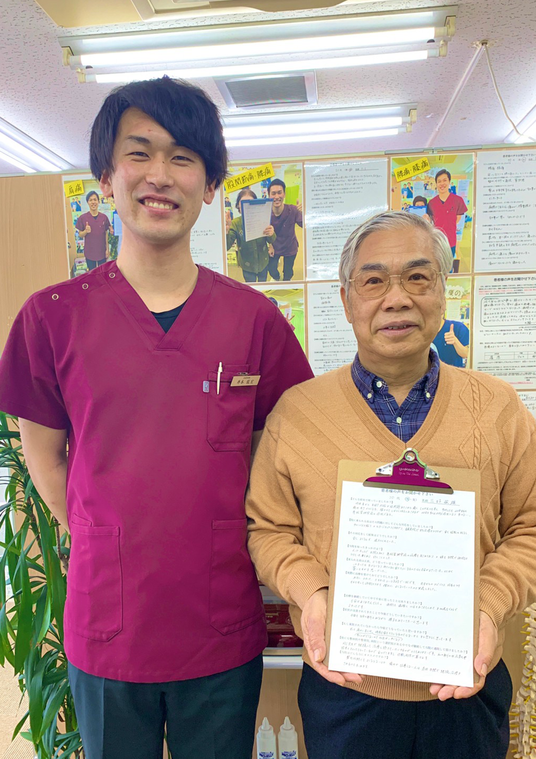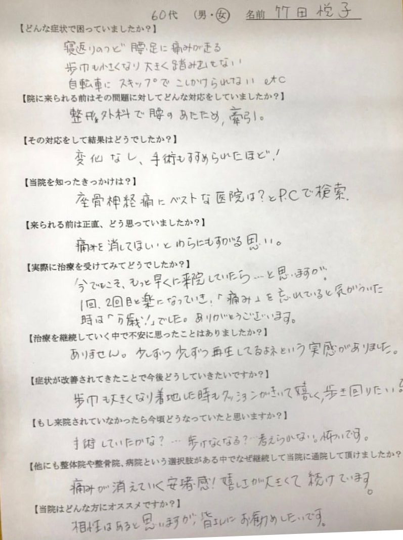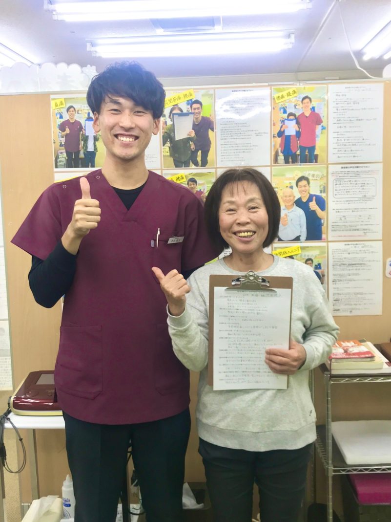 痛みの改善を実感できたので、先生を信頼して通院することができました。本当に先生に治療していただいてよかったと、感謝の気持ちでいっぱいです。
